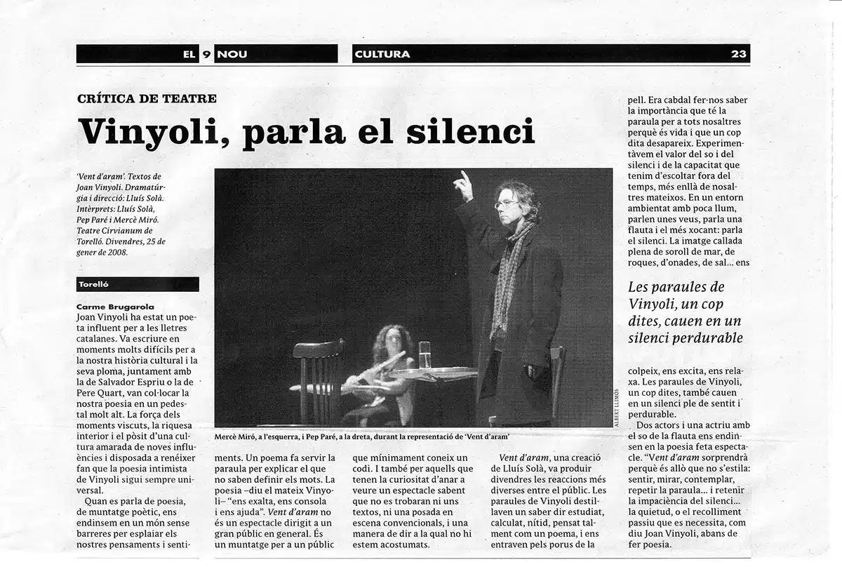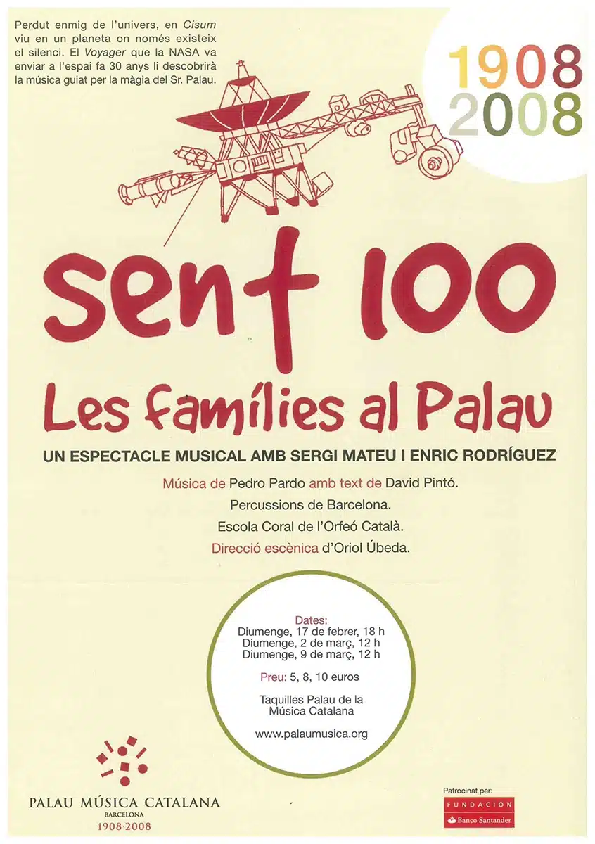 Com el 2007 també un any carregat d’estrenes teatrals. Al gener s’estrenava a Torelló Vent d’aram, un espectacle sobre poesia de Joan Vinyoli dirigit per Lluís Solà que més tard faria temporada al Brossa Espai Escènic. Al mateix escenari, a l’abril, hi arribava El parany de Medusa, d’Eric Satie, una peça feta amb coproducció amb Cambalache dirigida per Zep Santos. I abans, al febrer arribava al Palau de la Música Catalana Sent 100, un espectacle per a commemorar el centenari del Palau amb direcció d’Oriol Úbeda, llibret de David Pintó,  música de Pedro Pardo i coreografies d’Ester Bartomeu, amb la participació de tots els cors infantils i juvenils de l’Orfeó Català.